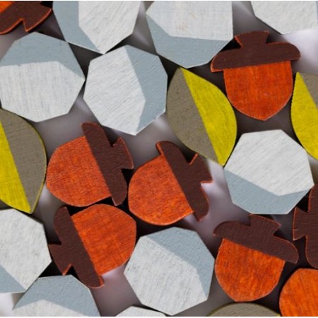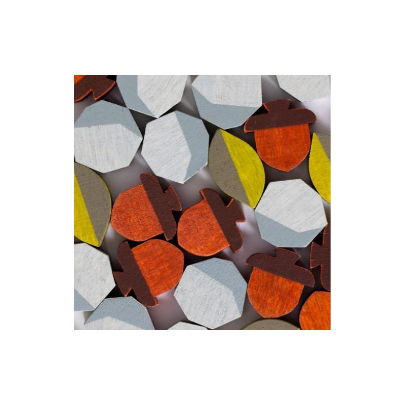 Comprend 45 pièces de bois teintées et sérigraphiées (15 de chaque ressource).
