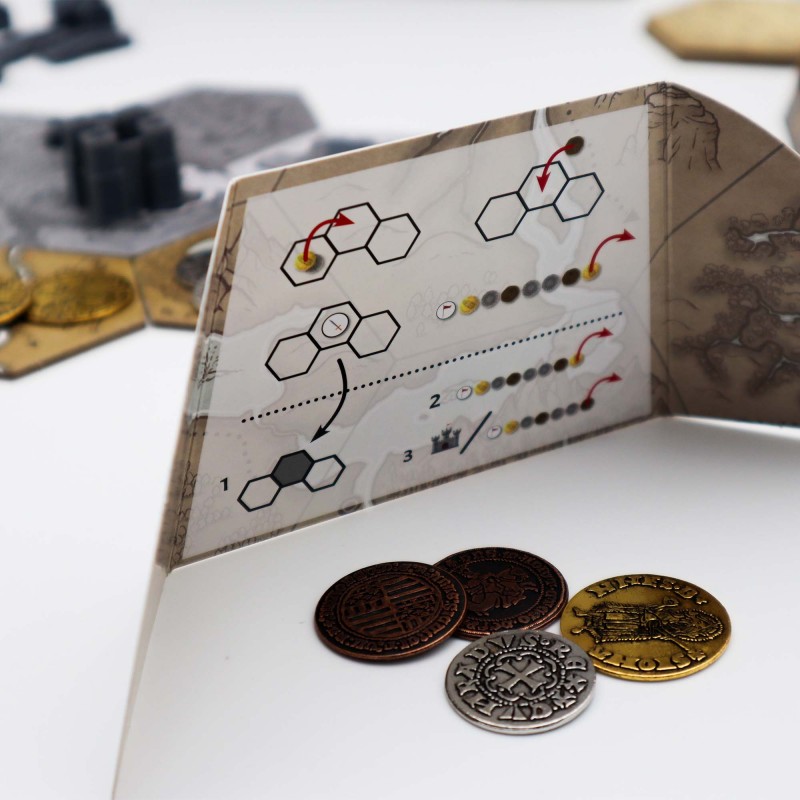 La réserve de pièces de chaque joueur est gardée secrète. Lorsque tous les territoires ont été attribués (sauf un), la partie se termine. Chaque territoire rapporte de 1 à 5 points selon les bâtiments présents. La faction avec le plus de points gagne. Le joueur avec le plus de pièces de cette faction gagne !