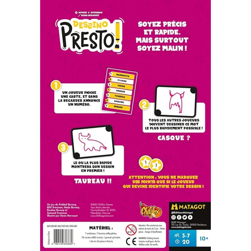Dessino Presto (Doodle Dash) est un jeu de société où les joueurs doivent dessiner le même mot au même moment. C'est une compétition de dessin où la vitesse peut battre l'habileté, donc tout le monde peut gagner ! Gagnez en étant le gribouilleur le plus rapide, mais attention - vous ne marquez des points que si la personne qui devine le mot peut réellement dire ce qu'est votre dessin ! Si vous êtes trop rapide, votre taureau peut facilement se transformer en fantôme ou en casque de viking.